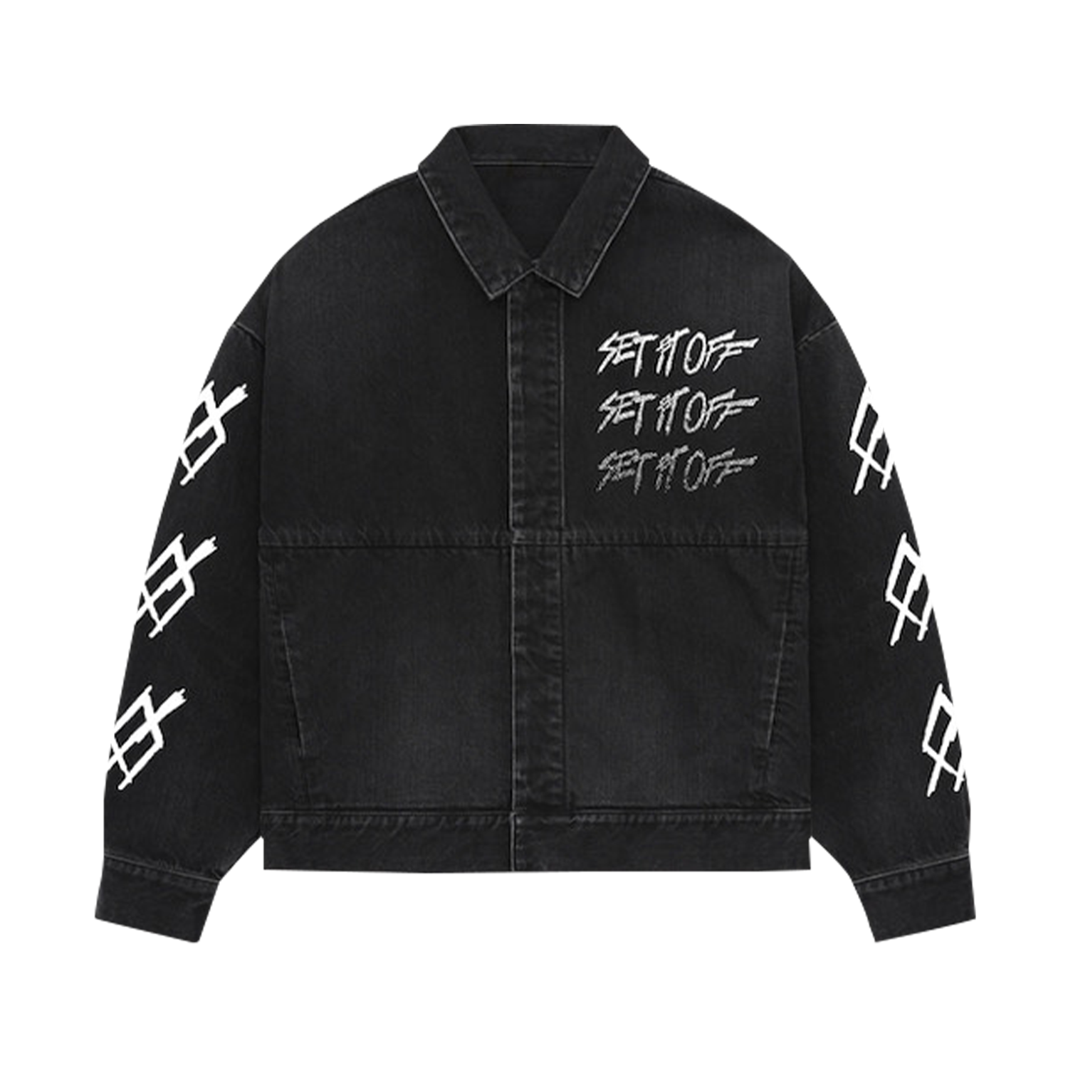 🚨SET IT OFF DENIM JACKET🚨 Just look at it! This custom cut and sew denim Set It Off jacket is so sick, and features a huge back print based on the art for our new self-titled album, arm details and Set It Off logo on the chest.